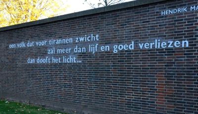 De bakstenen muur met de tekst van Van Randwijk is een ontwerp van Gerda van der Laan. Op 12 maart 1945 vond hier, het Weteringplantsoen te Amsterdam, een executie plaats van dertig verzetsstrijders.