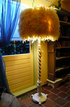 Al een tijd speelde ik met het idee om een lamp te maken van mooie witte veren. De veren had ik al gevonden alleen wist ik nog niet goed hoe daar een lamp van te maken. Tot ik in een kringloopwinkel een prachtige staande vintage lamp zag staan. Ik nam hem mee en knapte hem op. Schuren, een wit verfje. Ik verving de kap door een andere grote kap, die ik helemaal kaal stripte.