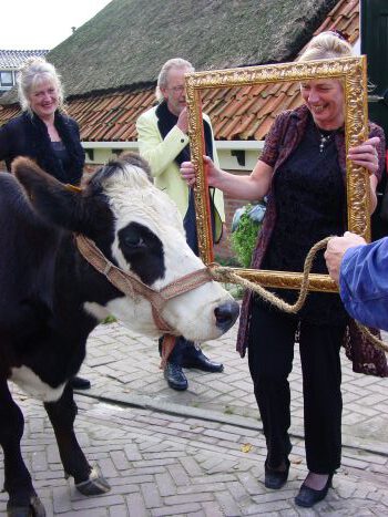 Op het laatste nippertje bleek dat er nog een speciale vergunning moest komen omdat in die tijd net de ‘Gekke Koeienziekte’ heerste. Koeien mochten niet worden vervoerd. De dag van de opening was het prachtig weer. Hennie sjokte welgemoed naar de galerie, alwaar een heel ontvangstcomité klaar stond. Mirjam de Meijer, gedeputeerde van cultuur van de provincie Groningen, haalde de lijst van Hennie af. Vervolgens stopte ze een foto van Hennie, die we eerder die week hadden genomen, in de lijst. Deze werd vervolgens op een schildersezel bij de ingang gezet … en de galerie was geopend!