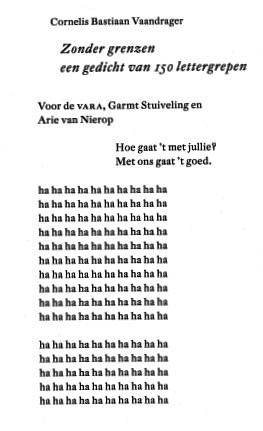 In 1962 kreeg dichter Cornelis Vaandrager het verzoek van de VARA om een gedicht te schrijven met als titel Zonder grenzen. Het werkstuk diende ten minste 150 lettergrepen te tellen, en als vergoeding zou de dichter vijftig gulden ontvangen. Vaandrager stuurde onderstaand poëem in. En ontving nimmer het toegezegde bedrag.